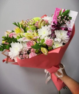 Сочетая кустовые розы, изящные лилии, яркие альстромерии и пышные хризантемы, этот букет является шедевром флористического искусства. Каждый цветок тщательно подобран для создания утонченного, но яркого букета. Представленный в спокойной, нежной упаковке, он идеально подходит для важных моментов, подчеркивая красоту и оригинальность событий.